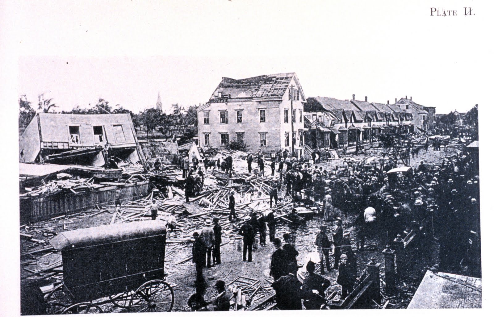 It raised for a moment, then came down again into a thickly settled area west of Union Park. At full force, it rampaged down Springfield Street, taking out houses on either side, ripped across Union Park and into some houses beyond, leaving behind ruin over half a mile long and three hundred yards wide. Several residents lost their lives.